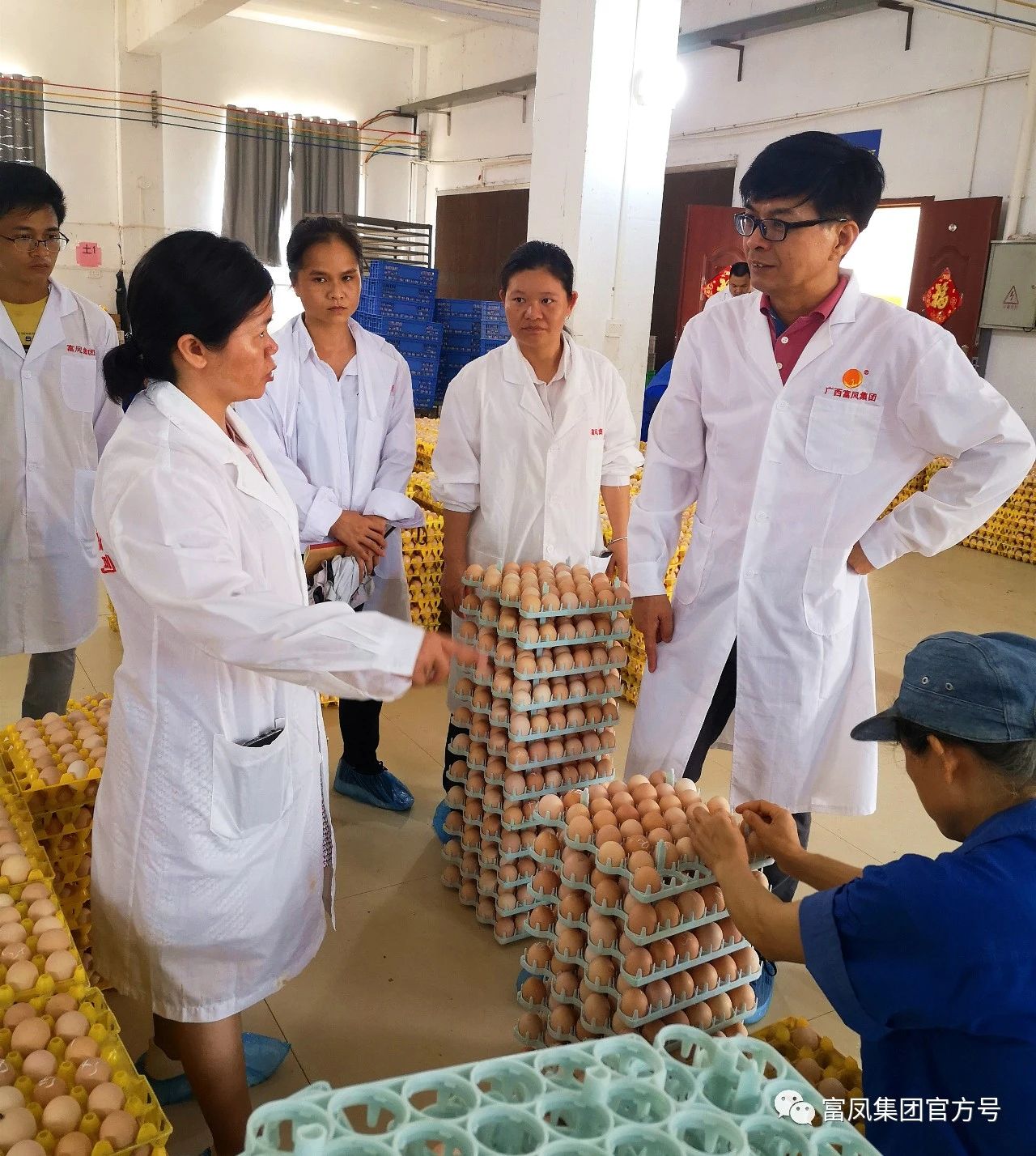 ▲在孵化车间,检查和了解鸡苗生产情况,并就相应的技术指导。