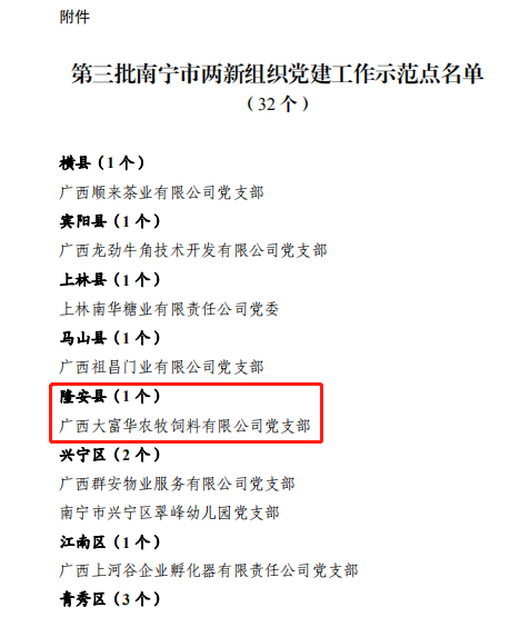 9月15日,中共南宁市委员会组织部、中共南宁市非公有制经济组织和社会组织工作委员会南组通2020〕79号《关于公布第三批南宁市两新组织党建工作示范点名单的通知》,广西大富华农牧91短视频污下载有限公司党支部确定为南宁市两新组织党建工作示范点。